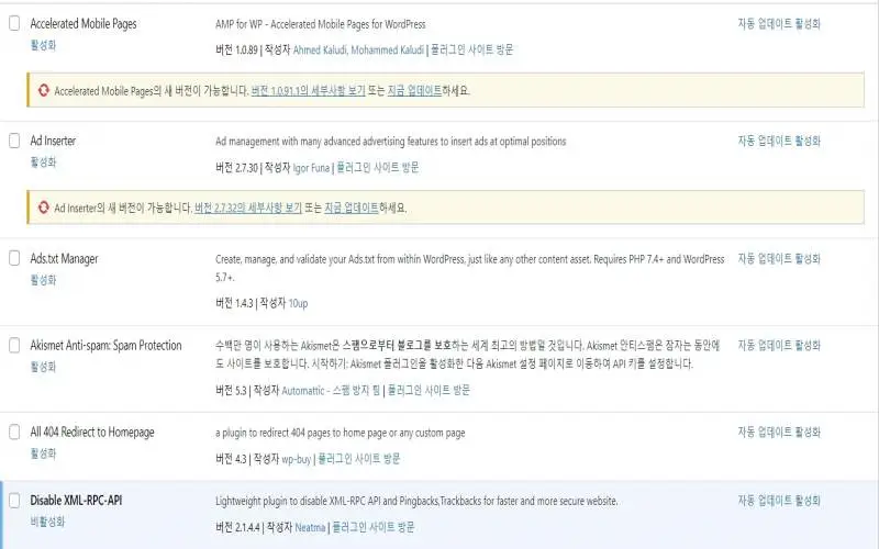 카페24에서 기본적으로 설치한 플러그인 수가 무려 21개, 그 중 활성화 된 것은 4개 비활성화가 17개입니다. 이는 필요에 따라 활성화 시켜 사용하면 된다는 의미입니다. 이런데 이 플러그인들이 저장용량을 심각하게 차지한다는 것입니다. 카페24 측에서야, 사용자가 웹 용량 부족으로 늘려 달라고 하면 유료 결재를 요구하면 되니, 남는 장사인 셈입니다.