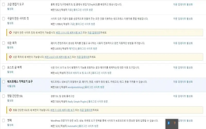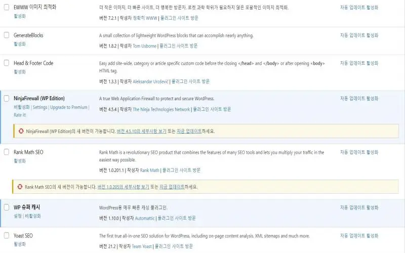 설치된 플러그인 특징들을 보도록 하겠습니다. 가장 먼저 눈에 띄는 것은 SEO최적화 플러그인인 Rank Math SEOYoast SEO가 설치돼 있습니다. 둘 중 하나만 사용하고 나머지는 지우시는 게 좋습니다. 가뜩이나 용량도 부족한데 덩치가 비교적 큰 플러그인에 해당하는 두 녀석을 모두 데리고 있을 이유가 없는 것입니다. 나머지는 사실 꼭 필요한 플러그인인지, 모르는 것들이 너무 많습니다.